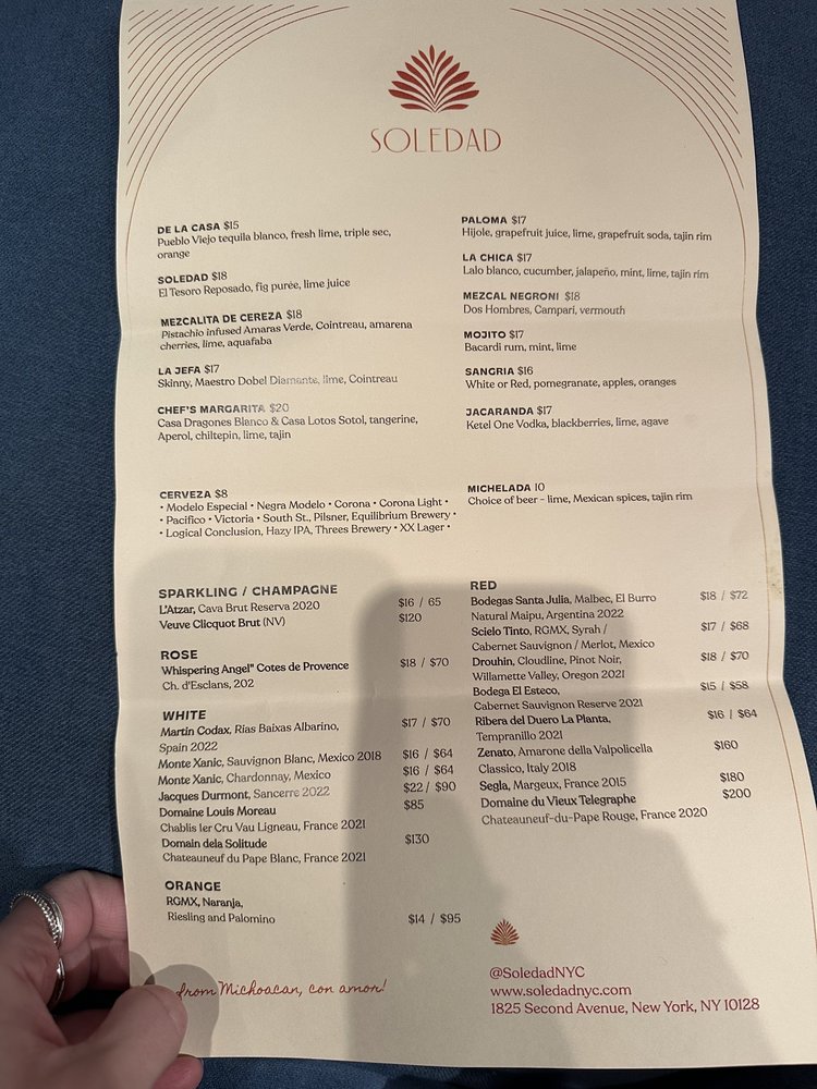 Welcome to Soledad, a distinguished Mexican restaurant located at 1825 2nd Ave, New York, NY. This culinary gem invites you to indulge in a vibrant menu that captures the essence of authentic Mexican flavors while elevating the dining experience with sophistication and style.